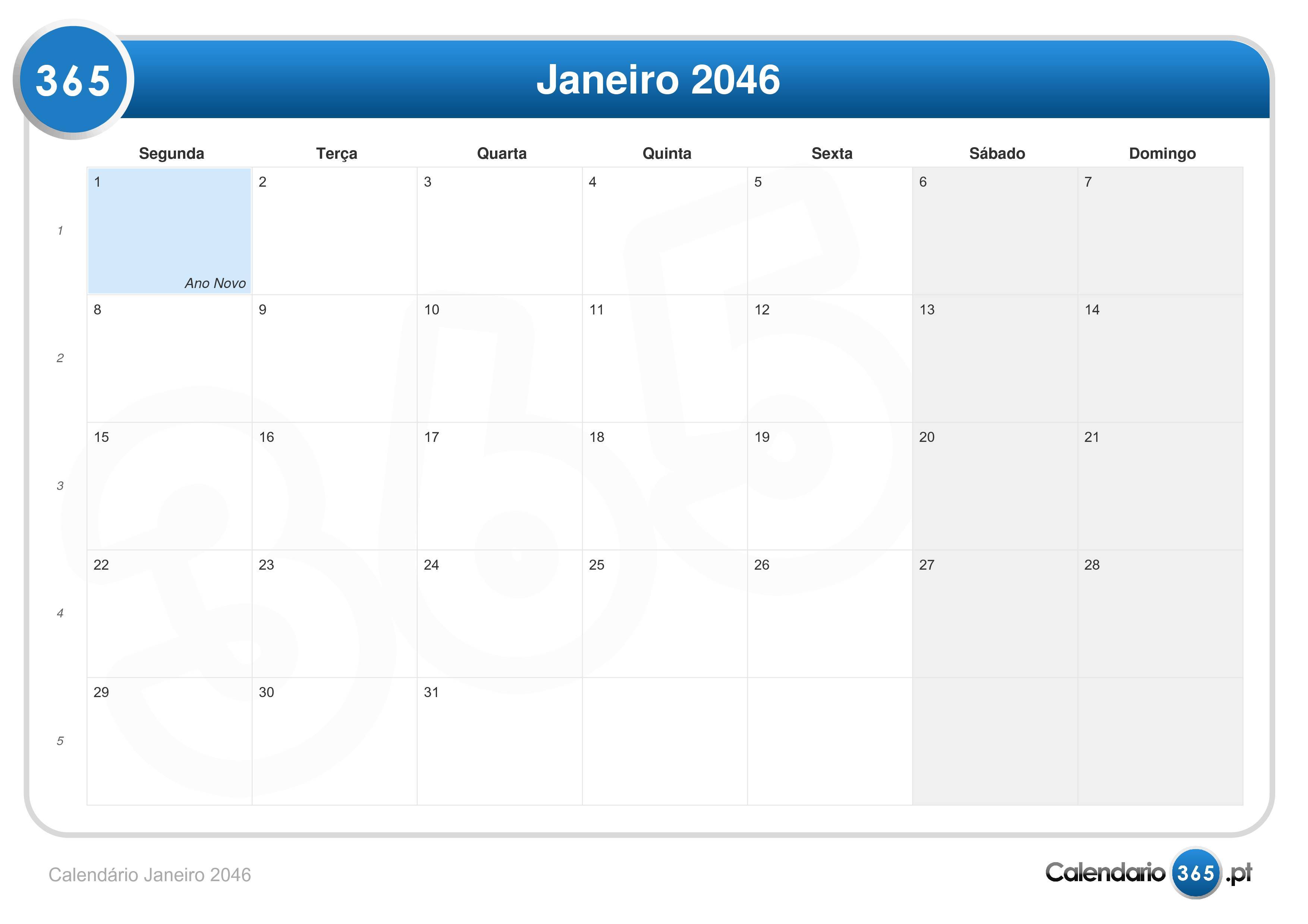 Calendário janeiro 2046 (Formato de paisagem)Ir para Calendário 2046.