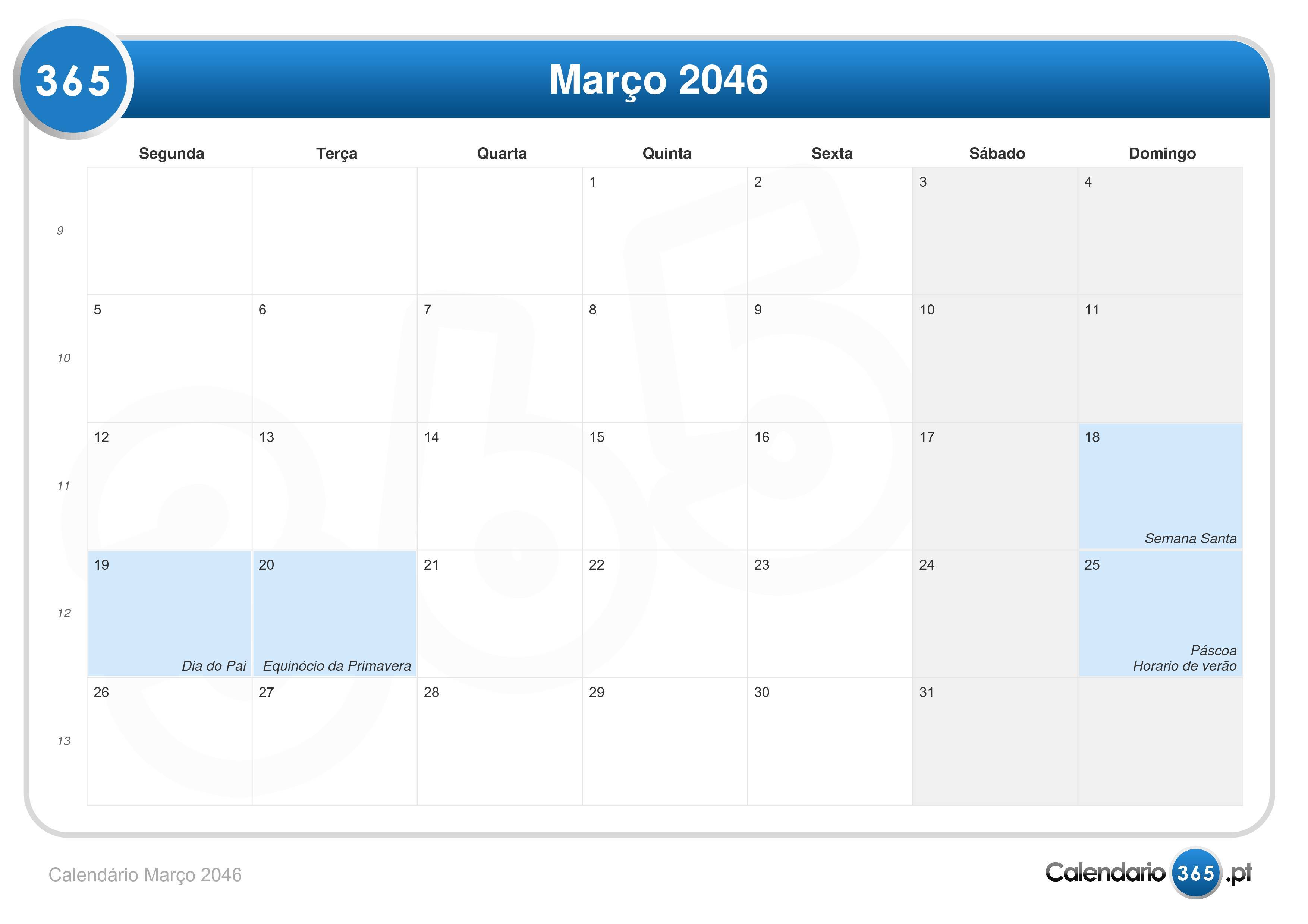 Calendário março 2046